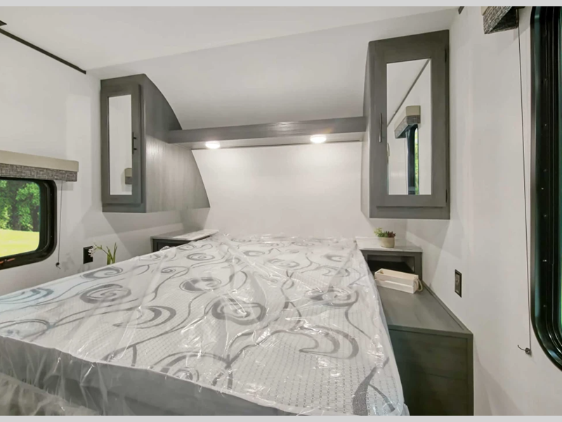 Each is built with a heated and enclosed underbelly for added protection against the elements, plus there is a power tongue jack and electric stabilizer jacks for easy set up. The 6' 10" interior height inside will make your space feel more open, and the pleated night shades throughout will provide privacy and shade when needed.