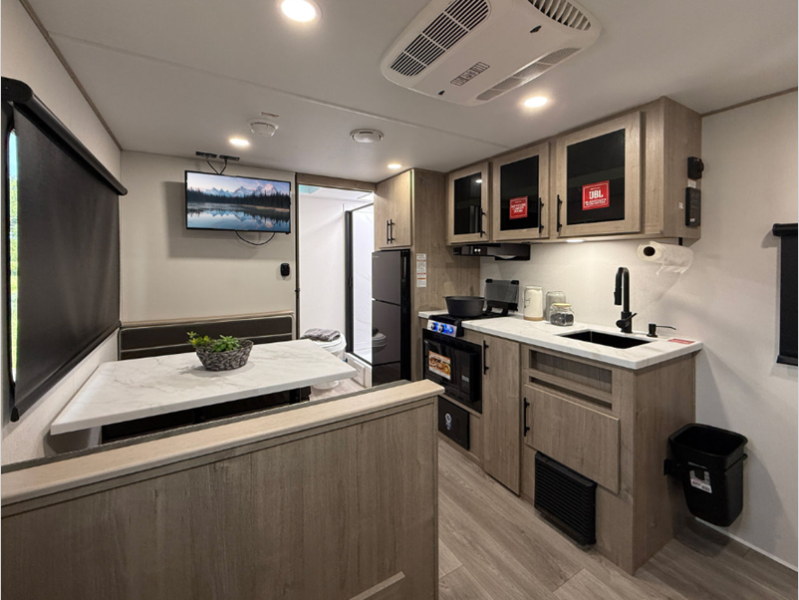 Sleeps 6 Length 23 ft 10 in Ext Width 8 ft Ext Height 10 ft 5 in Int Height 0 ft Hitch Weight 468 lbs GVWR 6395 lbs Dry Weight 4538 lbs Fresh Water Capacity 37 gals Grey Water Capacity 45 gals Black Water Capacity 37 gals Tire Size ST215/75R14LRD Furnace BTU 20000 btu Available Beds Queen Refrigerator Type 12V Refrigerator Size 10 cu ft Convection Cooking Yes Cooktop Burners 2 Number of Awnings 1 LP Tank Capacity 20 lbs Water Heater Type On Demand Tankless AC BTU 13500 btu Cargo Deck Size 0 ft TV Info LR High Def TV Awning Info 16' Adjustable Power with LED Lighting Axle Count 1 Number of LP Tanks 2 Shower Type Standard Electrical Service 30 amp Similar Floorplans