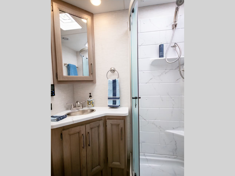 The cockpit is every pilot's dream with its 14" touchscreen dash radio with Bluetooth, backup and side view cameras, plus reclining and swivel Leatherette captain's chairs. The interior of the A.C.E is designed to make you feel at home with flat panel cabinets, spacious living quarters, and convenient kitchens that include everything you need while you're on the road.